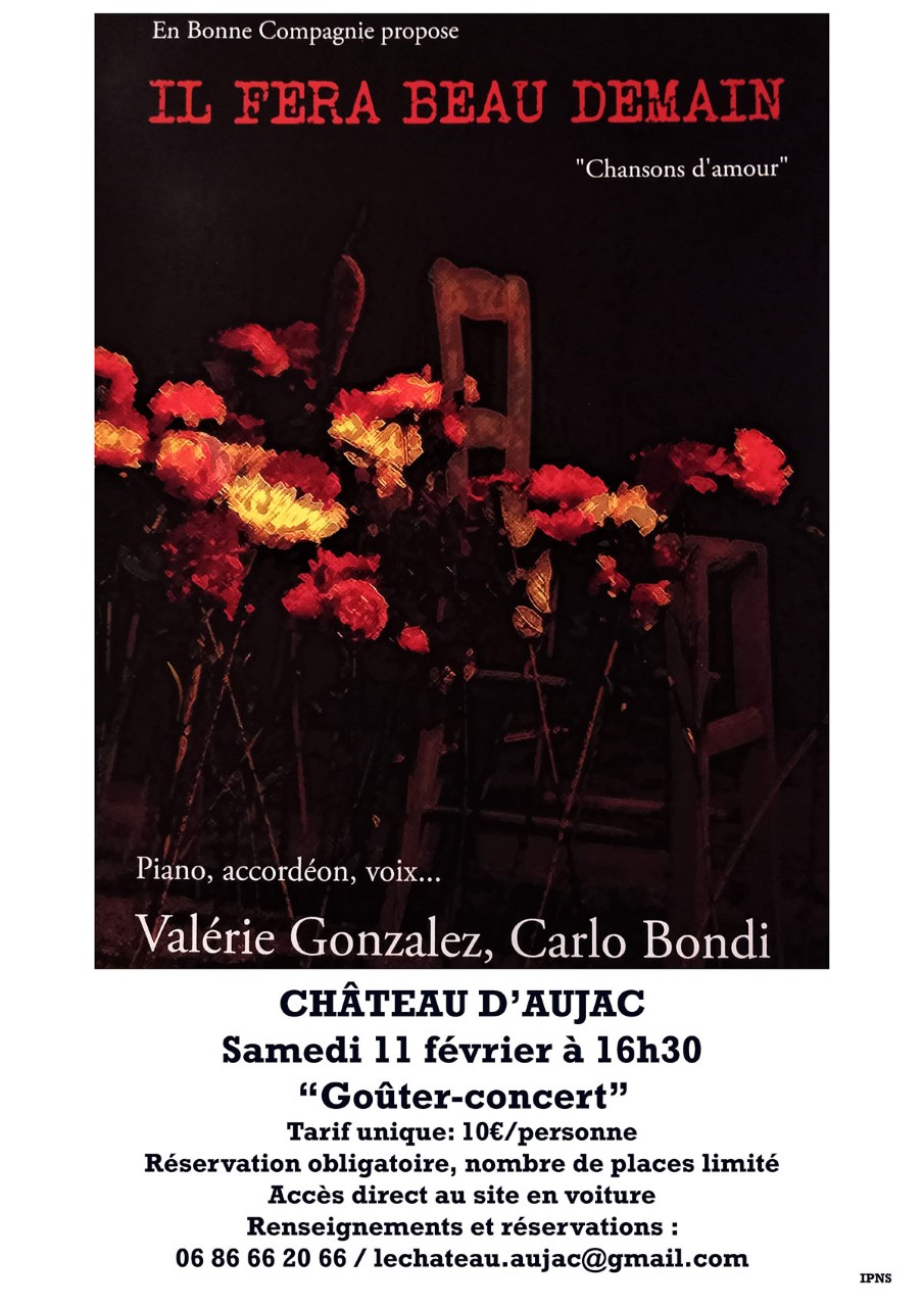 à 16h30 goûter concert : piano, accordeon, voix : Valérie Gonzalez, Carlo Bondi Tarif : 10 € par personne Réservation obligatoire au 06 86 66 20 66 ou lechateau@gmail.com
