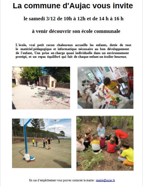 de 10h à 12h et de 14h à 16h La commune d'Aujac vous invite à découvrir son école qui dispose de tout le matériel pédagogique et informatique nécessaire au bon développement de l'enfant