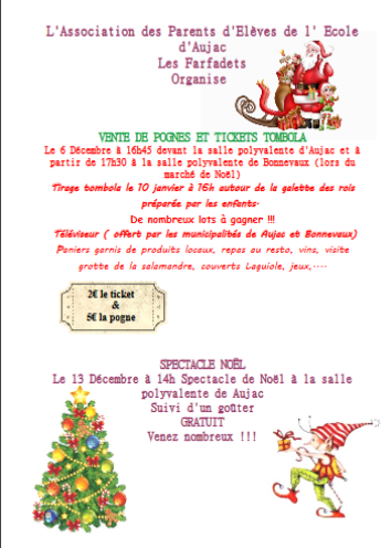 Lors du passage des"Paniers" d'Aujac à 16h45, l'APE proposera une vente de pognes et aussi une vente de billets de tombola au profit des enfants de l'école