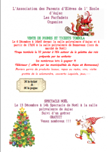Lors du passage des »Paniers » d’Aujac à 16h45, l’APE proposera une vente de pognes et aussi une vente de billets de tombola au profit des enfants de l’école