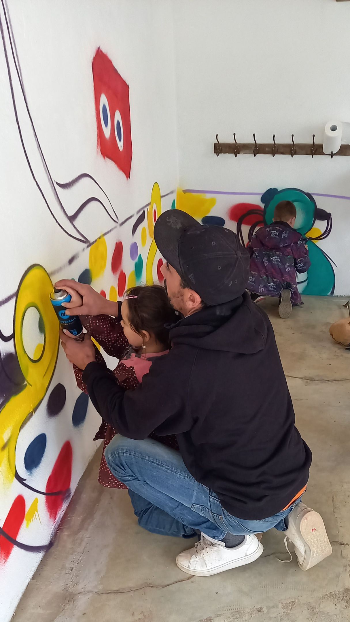 La maquette est là, maintenant il faut s’attaquer à la réalisation de la fresque. La bombe, c’est simple quand on fait un trait, la main bien parallèle au mur… quand il faut ombrer en caressant la paroi, c’est déjà plus complexe mais ça s’apprend. Et puis Yann est là pour corriger les petites imperfections, on sent qu’il a l’habitude de travailler en milieu scolaire… « Et heureusement, c’est de la peinture à l’eau ! »