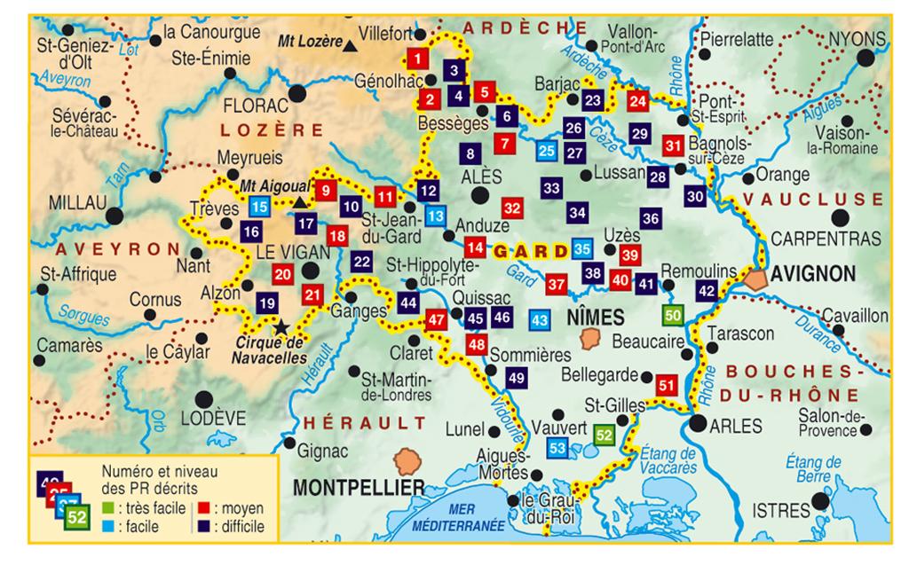 GRP Le Cévenol ( 130 km): >Aujac (Gard) > Charnavas > Génolhac >Villefort ( Lozère) >La Garde-Guérin>Pourcharesse>Le Thort>La Bastide Puy Laurent> Saint Laurent les Bains> Tressol >Ourlette >Pradons ( ardèche)>Montselgues >Thines>Le Peyras>St Jean de Pourcharesse > Les Fabres >Champmajour >Chambonas > Les Vans >Naves> Brahic> Malbosquet> Aujac(gard).
