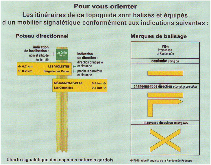 Certains sentiers portent les sigles GR, PR et GRP correspondant à des balises de couleur blanc/rouge ou jaune ou jaune/rouge. Ce sont des marques déposées par la Fédération Française de la Randonnée Pédestre